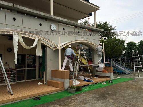 神奈川県内で施工させていただいた幼稚園テントを施工させていただきました。 こちらは幼稚園の軒先に設置されるシェルターテントを施工している際の写真です。 職人がすでに設置されたフレームにテント生地を設置しようとしている瞬間です。 弊社では写真の…
