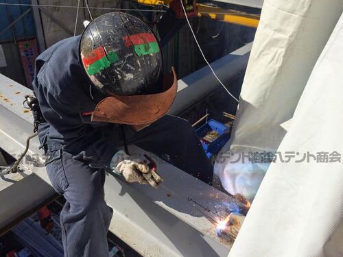 丸八テント商会です。 産業用のテント こちらは、大型のテントを施工している様子です。 弊社では,サイズを問わずバリエーションに富んだテントをお作りしています。是非、お問い合わせください。