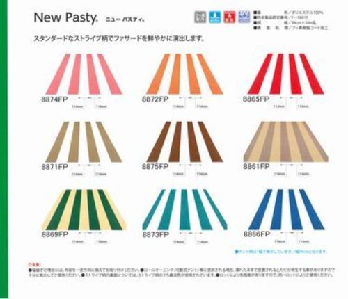 こちらテント生地「ニューパスティ」です。カラフルなデザインとバリエーションが人気です。オーニングや庇テントに使用させていただきます。弊社ではテント設計、施工のみならず生地のみの販売もしております。御気軽にお問い合わせくださいませ!