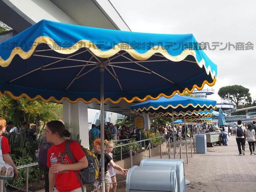 今回は海外テント事例・アメリカ編をご紹介いたします。 こちらは先日弊社スタッフがアメリカを訪問した際に撮影したパラソルです! 青色の生地にゴールドのワンポイントがとてもおしゃれです! また、パラソルがあることで、アトラクションに乗るのを待って…