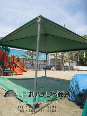 2014-04-19 固定式テント 幼稚園 ネコ除け 西陣カーボン・西陣帆布 回は固定式テントについてご紹介させていただきます。こちらは幼稚園で使われています。下のシートはネコ除けになっておりさらに便利になっています。また、駐車場にも使われています。地面の色と同じような配色にすることで統一感が生まれますよね。